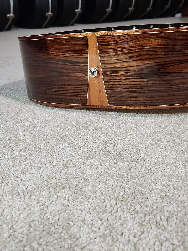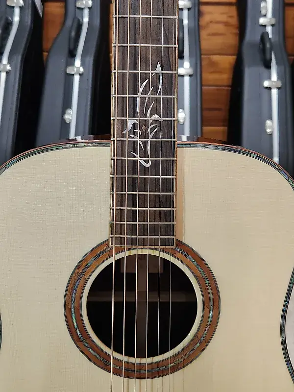 Звуковое отверстие украшено розеткой с кольцом из высококачественной массива коа с инкрустацией из зеленого абалона.