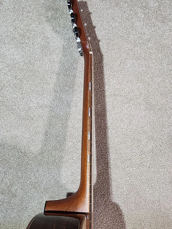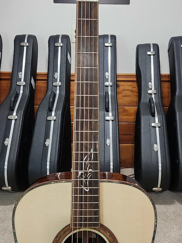 Гриф украшен великолепными передними инкрустациями в виде листьев из перламутра. Подобный узор выполнен из зеленого абалона на головке грифа.