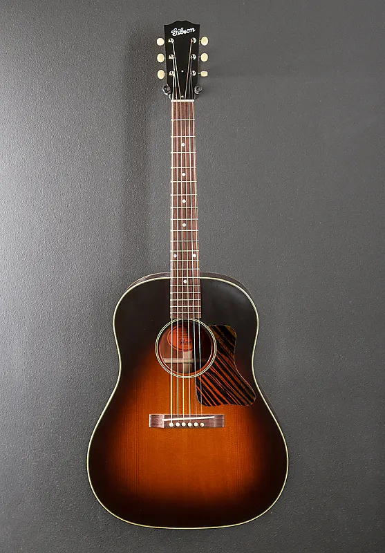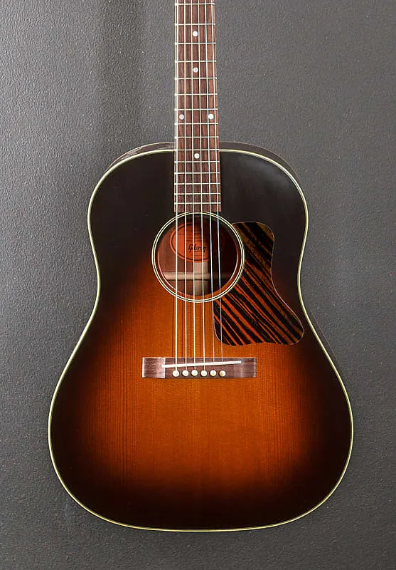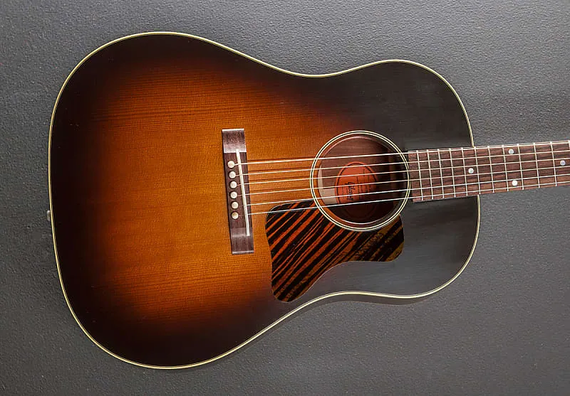 Винтажный сандберст, форма корпуса Round Shoulder Advanced Jumbo, тонкая финишная отделка VOS на основе нитроцеллюлозного лака, термически обработанная верхняя дека из красной ели, традиционный вручную вырезанный X-бежинг Red Spruce, спинка и обечайки из махагони, многослойная окантовка деки и однослойная окантовка спинки, исторически сформированная