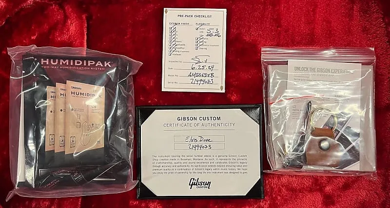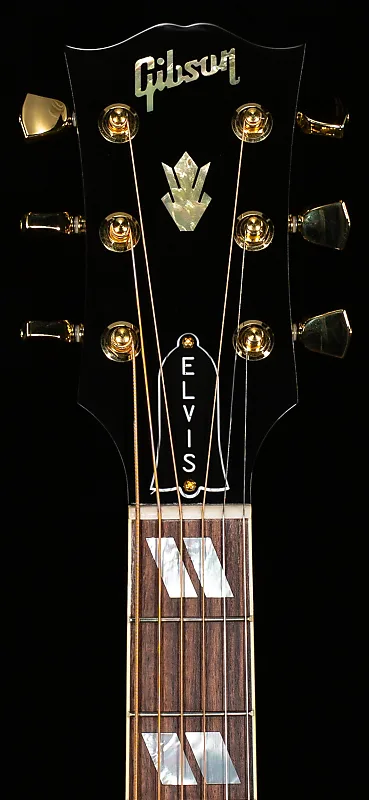 Gibson Elvis Dove основана на индивидуально настроенной Gibson Dove 1969 года, которую королю рок-н-ролла подарил его отец, Вернон Пресли, и на которой Элвис регулярно играл на концертах с 1971 по 1975 год, включая концерт Aloha From Hawaii 1973 года, транслировавшийся по спутниковому телевидению. В 1975 году Элвис подарил ее во время выступления удивленному зрителю на концерте в Эшвилле, Северная Каролина. Gibson Elvis Dove имеет цельную верхнюю деку из ели ситка, цельный корпус и стороны из клена, а также гриф из красного дерева с накладкой из палисандра. Она также оснащена современными электрониками LR Baggs VTC с пьезозвуковым датчиком под седлом и регуляторами громкости и тембра на звуковом отверстии, что делает ее готовой к сцене прямо из входящего в комплект жесткого кофра.