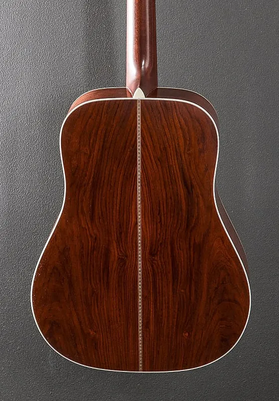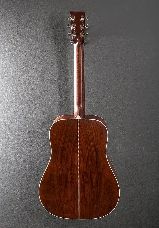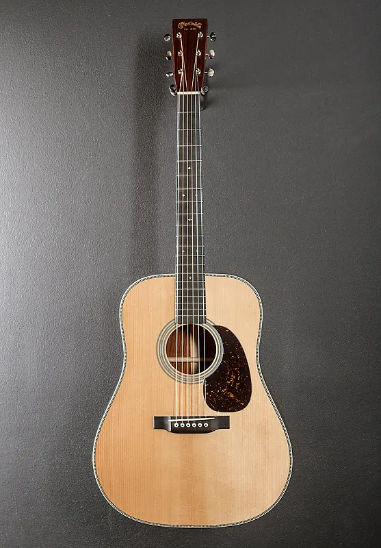 «Возможно, самыми почитаемыми винтажными D-28 являются те, которые созданы в 1937 году с передвижной вперед ручной гофрированной X-брейсинг, верхней дека из еловой древесины Адирондак и шириной грифа 1 3/4". Эта модель является обновленной версией, изготовленной с задней дека и обечайками из гватемальского розового дерева, и включает в себя некоторые тонкие улучшения спецификаций, чтобы сделать ее еще более верной оригиналу. Одним из основных обновлений является более точный профиль корпуса, основанный на дредноутах 1930-х и 40-х годов. Система VINTAGE TONE SYSTEM (VTS) от Martin используется для старения деки и брусов, что позволяет передать тональность эры 1930-х годов. Мастера Martin могут воссоздать приятную визуальную эстетику винтажной гитары и воспроизвести особые тона, ранее доступные только для винтажных инструментов.»