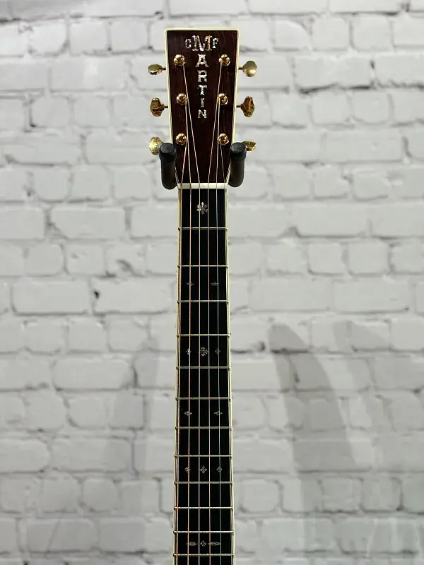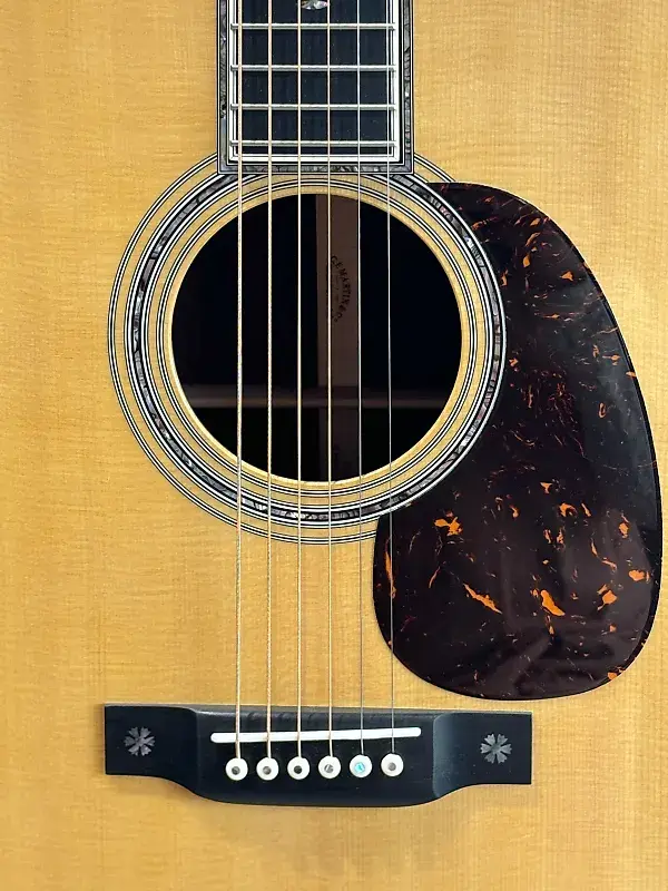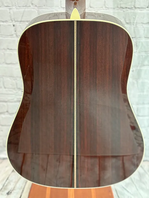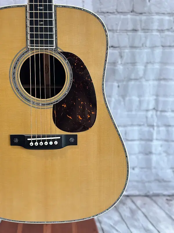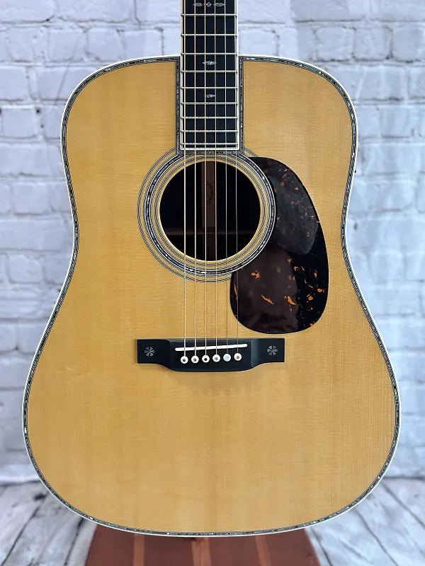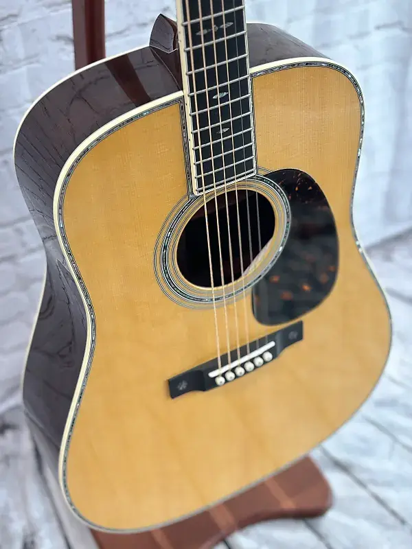 С задней частью и обечайкой из высококачественного индийского палисандра и верхней декой из ели, этот инструмент оснащен инкрустацией из перламутра и дополнен винтажными элементами, такими как антикварная белая окантовка и открытые колки. Мощный бас, сбалансированный с четкими высокими частотами, и высокопроизводительная шейка делают D-42 превосходным тональным шедевром, позволяющим играть часами без усталости.