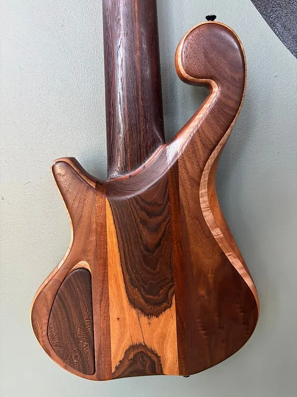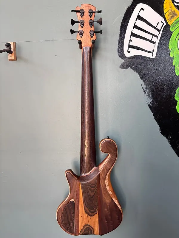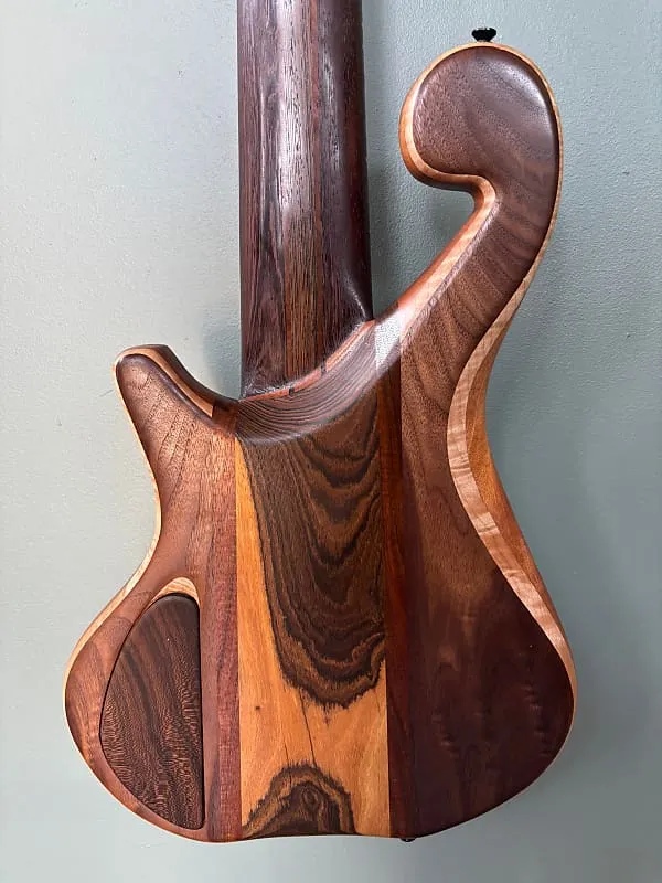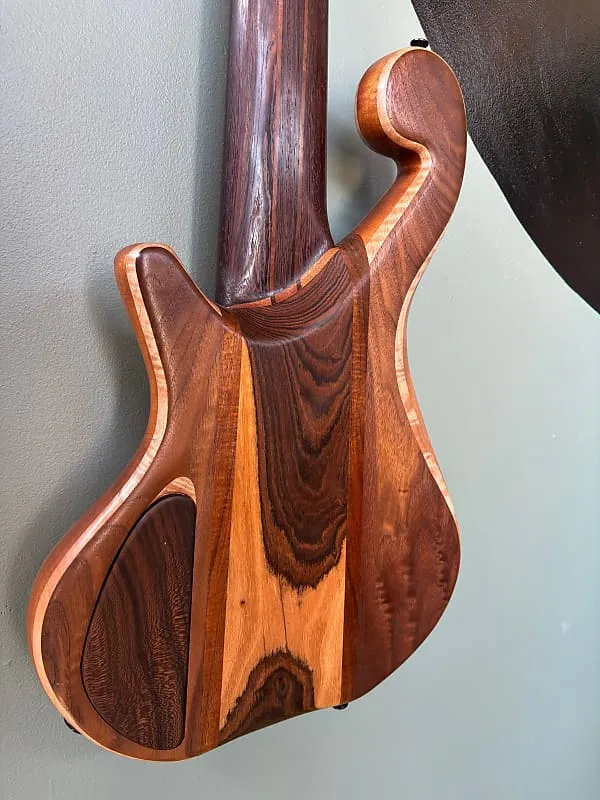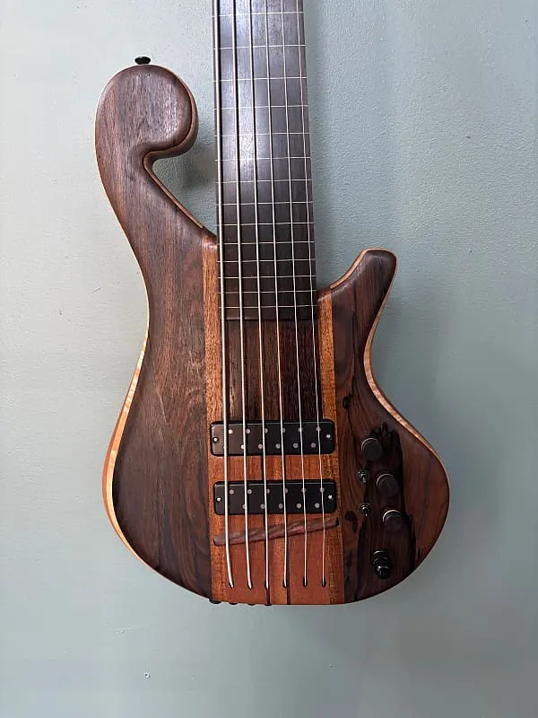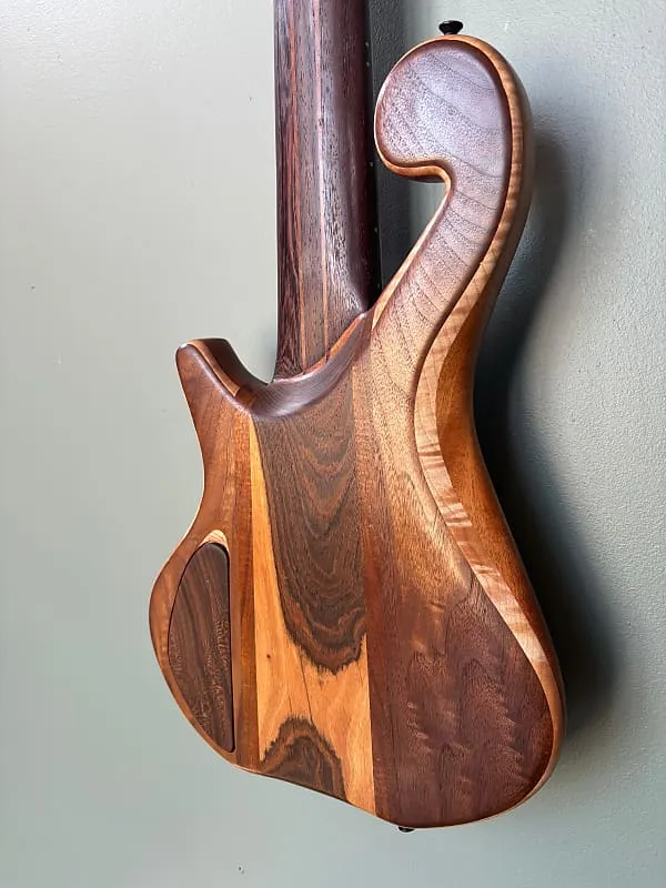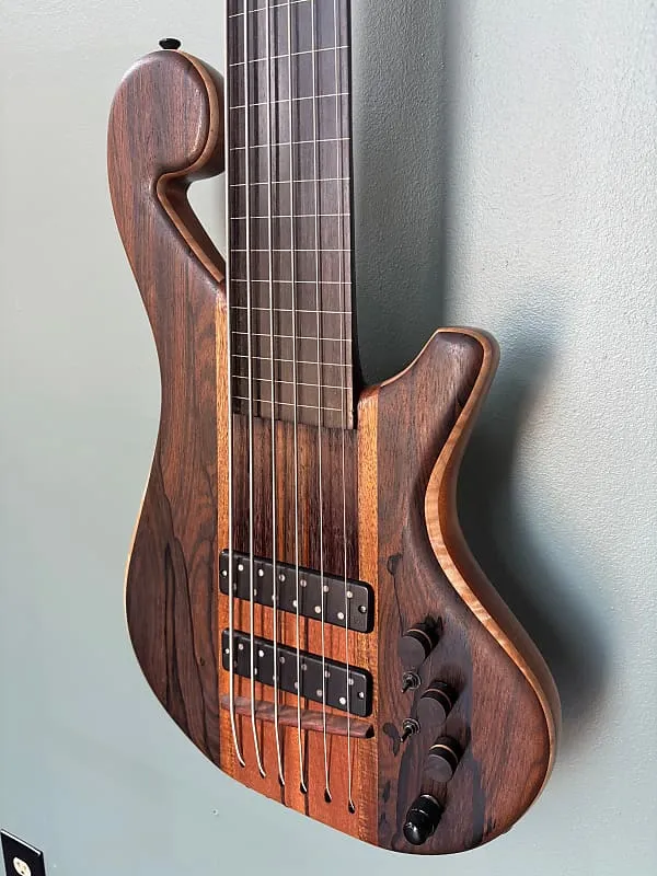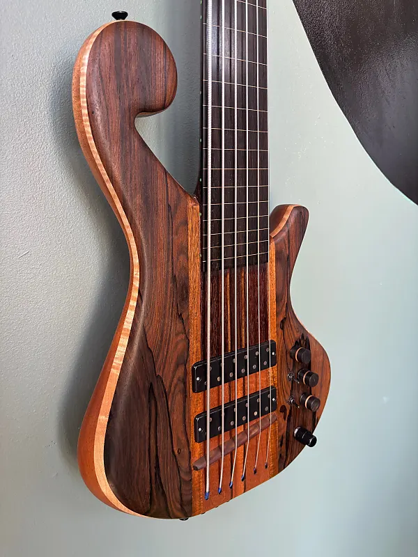 По спецификациям, этот великолепный инструмент имеет корпус из зириcкота/клена/махагон/клена/ореха, струны из кoa, гриф из венге/жареного клена, накладку из габонского эбенового дерева, ладовые линии из клена и головку грифа из фигурного ореха/махагон. Масштаб составляют 34”, 24 позиции ладов, струнодержатель из ореха/змеевика и два звукоснимателя Nordstrand Big Rig, подключенные к предусилителю Nordstrand с трехполосным эквалайзером и переключателями серии/одинарного/параллельного соединения для каждого звукоснимателя. Вес составляет 10,8 фунтов, установлены колки Hipshot ULTRALITE и жесткий футляр. По-настоящему фантастический инструмент, полностью уникальный!