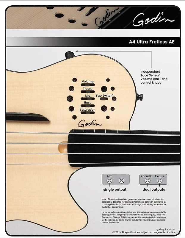 По нашему опыту, Godin давно является ведущим брендом гибридных акустических/электрических инструментов. Большинство их продукции ориентировано на гитаристов, но A4 Ultra Bass - это настоящая находка. Контрабасы массивны и их трудно перевозить, и сложно найти инструмент с цельным корпусом, который бы приблизился к такому насыщенному тону. Благодаря двухсекционному полому корпусу, A4 обладает теплым акустическим звучанием, которое заставит вашу аудиторию обратить внимание. A4 предлагает два способа игры: он оснащен звукоснимателем Lace Sensor и отдельными пьезоэлементами для седловой акустики. Или их комбинацией. Ниже приведена краткая разбивка по возможностям управления (см. также приложенное фото инструкции по управлению)