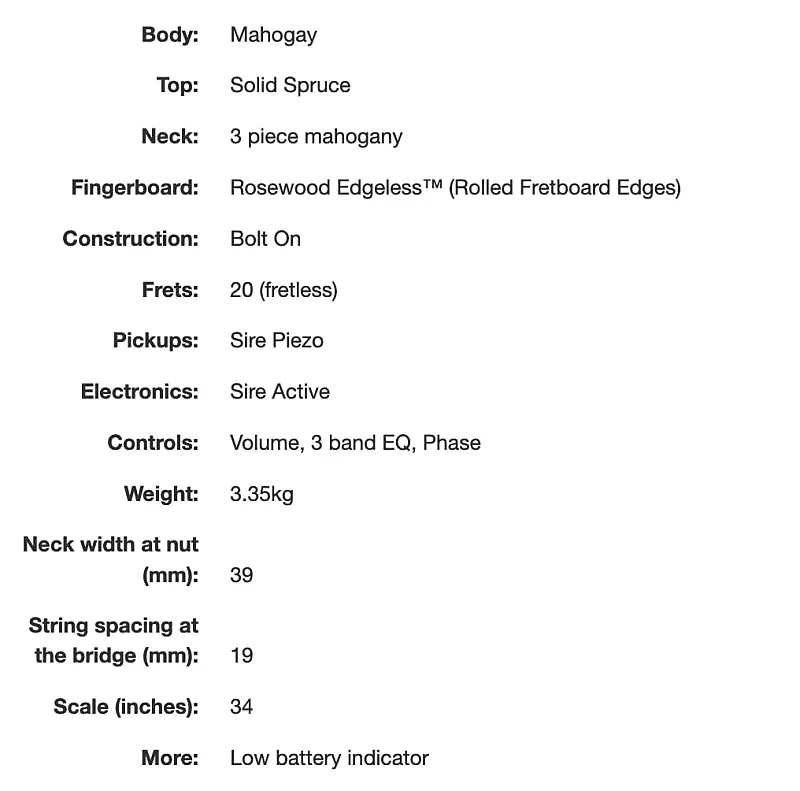 Корпус Sire GB5 выполнен из магаха с верхней декой из цельной ели, создавая акустическую эстетику, и соединен с 3-частным грифом из магаха с накладкой из палисандра для более легкого скольжения.