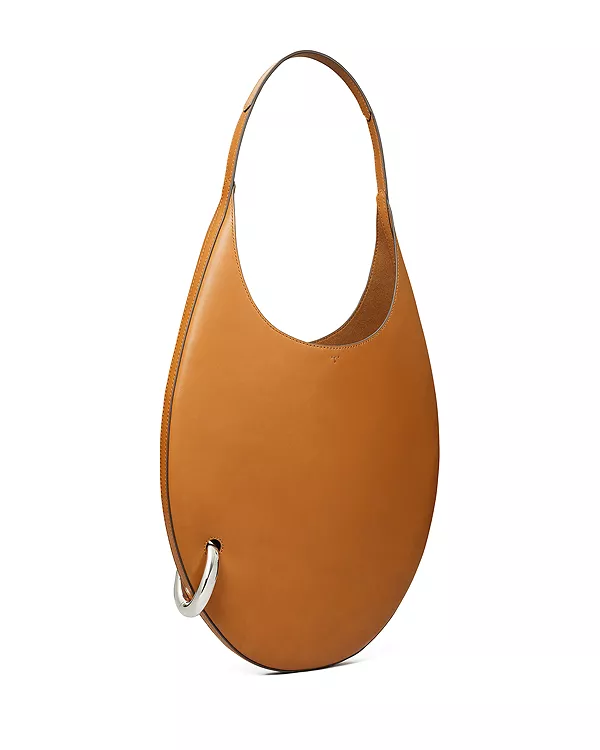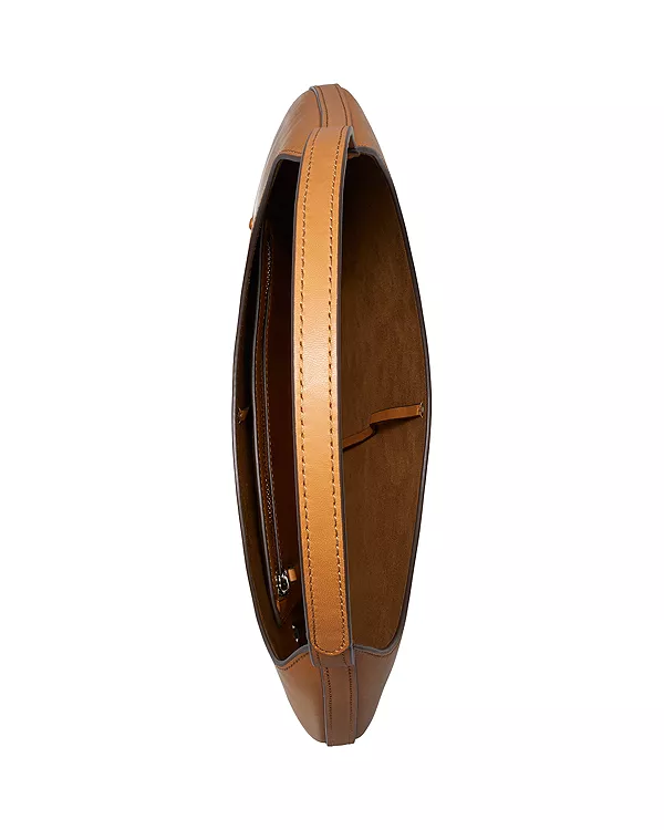Бренд: Tory Burch Цвет: коричневый Бестселлер коллекции Pierced продолжает развивать свой сюрреалистический стиль с помощью минималистичной сумки через плечо. Плоский овальный силуэт определяется изящным металлическим кольцом, которое пронизывает основание, словно ювелирное украшение. Завершает образ тонкий карман на молнии для удобной организации вещей. Представленная на показе весенней коллекции 2025 года, эта модель перекликается с коллекцией, вдохновленной текучестью и движением.