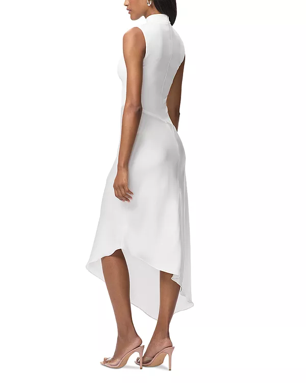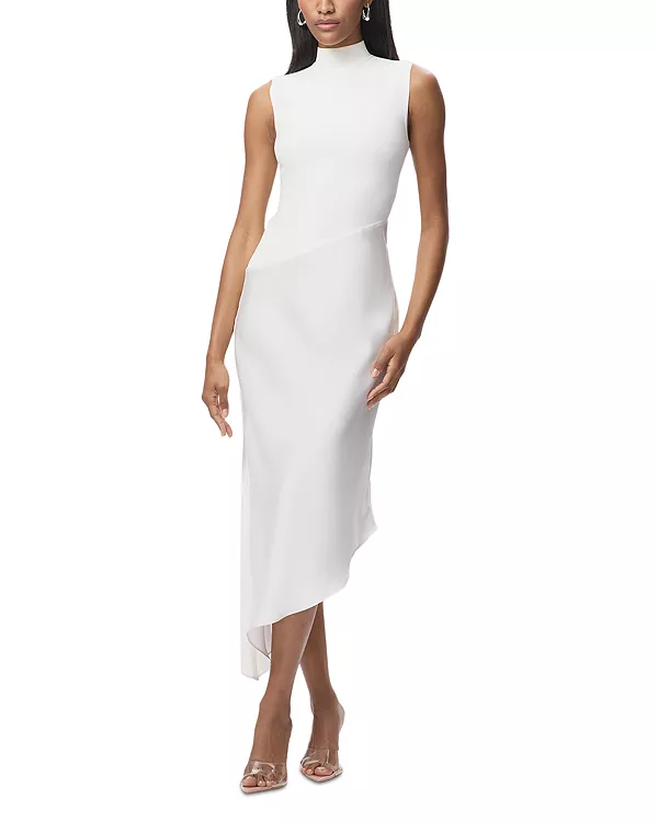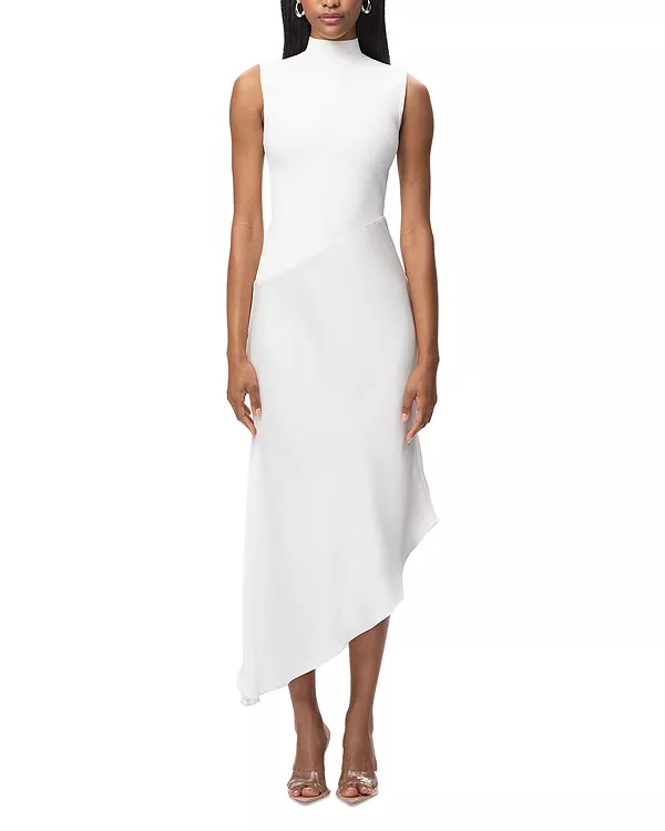 Как видно на примере 16-го образа из лукбука коллекции Resort '26, платье Esme от Hervé Léger представляет собой элегантный силуэт, скроенный из плотного трикотажа с юбкой из струящегося атласа. Платье имеет воротник-стойку и асимметричный подол.