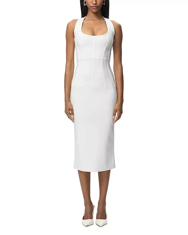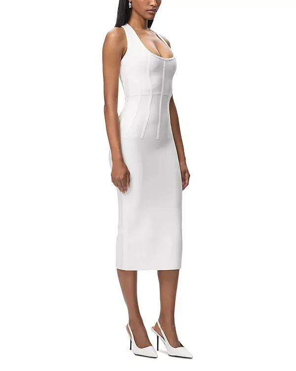 Платье Willa от Hervé Léger, представленное в образе № 20 из лукбука коллекции Resort '26, имеет силуэт миди и сшито из плотного трикотажа для облегания фигуры. Модель отличается вырезом-лодочкой и корсетной отделкой.