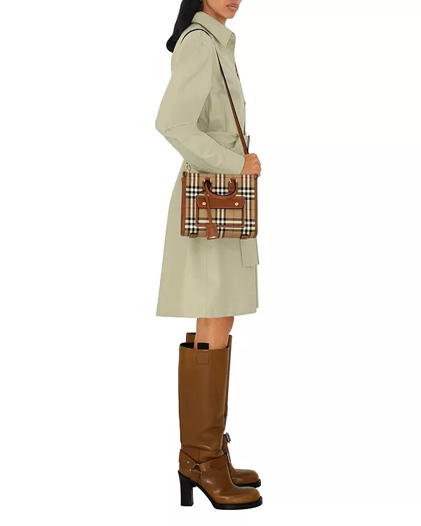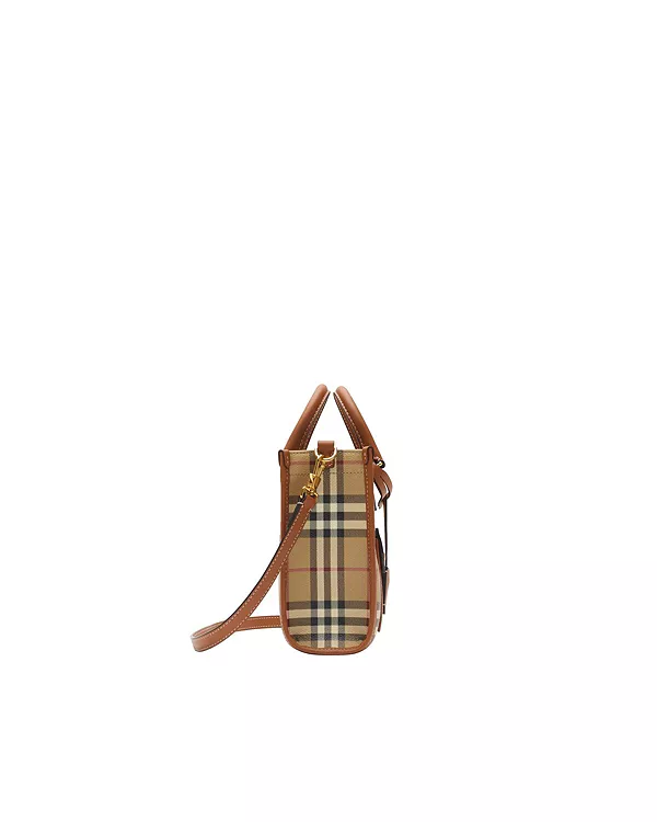 Бренд: Burberry Цвет: бежевый Компактная сумка-тоут, изготовленная в Италии из хлопковой смеси с покрытием и клетчатым узором Burberry, отделанная прошитой телячьей кожей и подкладкой из хлопка. Вдохновленная архивным дизайном, модель Freya имеет передний карман на магнитной застежке.