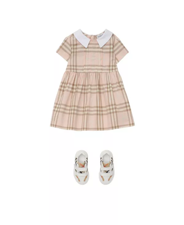 Хлопковое платье с клетчатым узором Burberry, с плиссированным верхом и контрастным воротником из хлопкового поплина. Короткие рукава и присборенная юбка отделаны замысловатой фестончатой каймой.