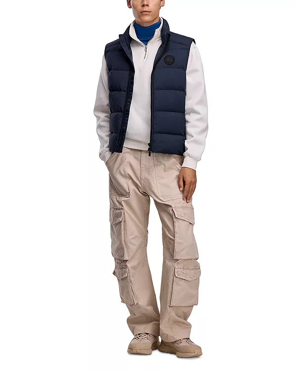 Особенности: Воротник-стойка Двусторонняя застежка-молния Без рукавов Два боковых кармана на молнии Трансформируется в сумку с ремешком для переноски Складывается во внутренний левый карман Сделано в Канаде