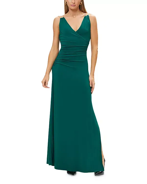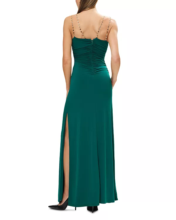 Новое платье Amal от Hervé Léger из коллекции Resort '26 сшито из облегающего фирменного трикотажа и украшено золотыми цепочками на спине. Платье имеет V-образный вырез с драпировкой, выполнено на подкладке, дополнено высоким боковым разрезом и застежкой-молнией по центру спины.