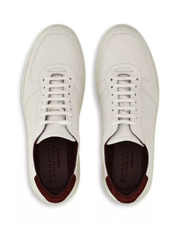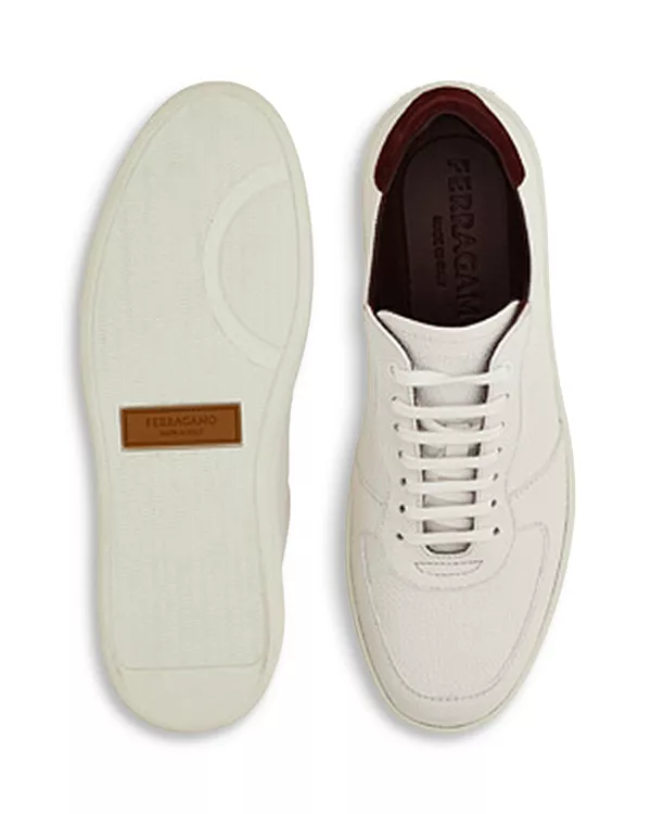 Четкие линии, высококачественные материалы и превосходное исполнение отличают эти низкие кроссовки Ferragamo с тисненым логотипом на язычке и крупным контуром Gancio на заднике. Они оснащены гибкой резиновой подошвой с ребристыми краями и оригинальным протектором.