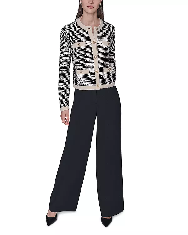 Текстурированный трикотаж, контрастная отделка на воротнике, планке, манжетах, карманах и подоле