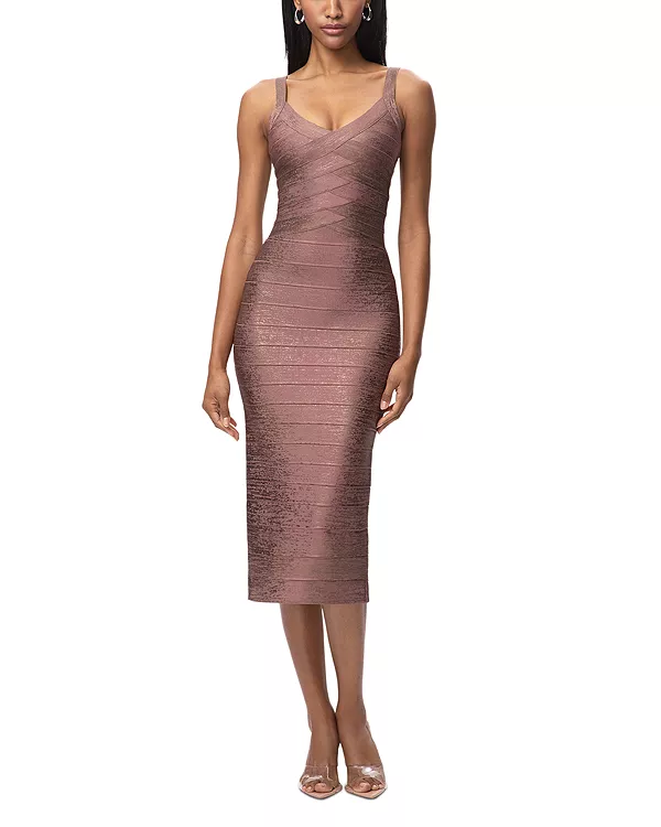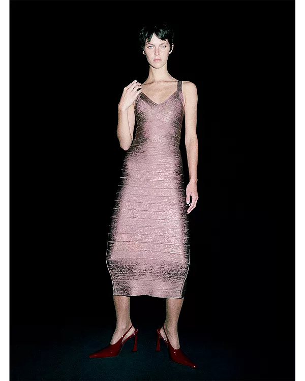 Платье Indie от Hervé Léger, представленное в образе № 17 лукбука коллекции Resort '26, - это облегающее платье миди из ткани с принтом в виде фольги в тон, с настоящим бандажным лифом.