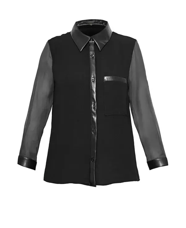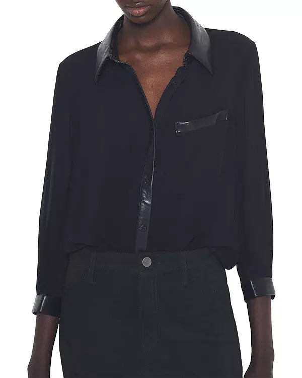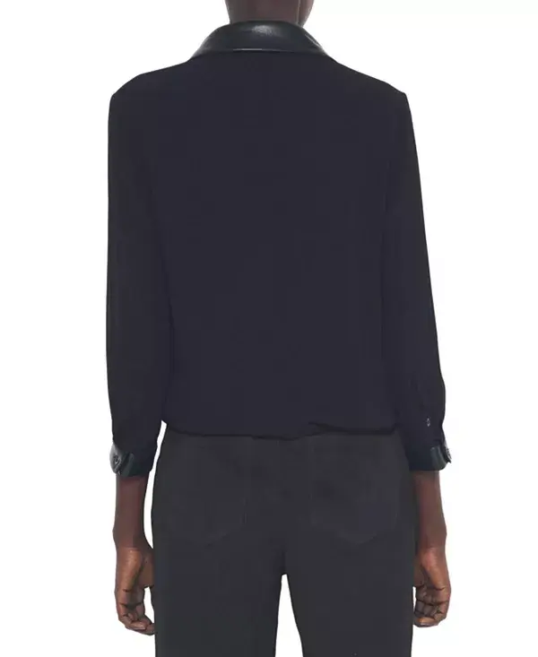 Бренд: As By Df Цвет: черный Блузка Faith - незаменимый элемент осеннего гардероба. Эта красавица отличается контрастным воротником из переработанной кожи, контрастной застежкой на пуговицах спереди, контрастными длинными рукавами с манжетами на пуговицах и изысканными пуговицами из ракушек. Сочетайте ее с любыми кожаными брюками и туфлями на каблуках для создания завершенного образа. Наша приверженность принципам устойчивого развития: мы не используем пластик. Упаковка AS by DF изготовлена из 100% переработанных материалов и на 100% биоразлагаема. Размер: соответствует стандартному размеру. Застежка на пуговицы по центру спереди. Контрастный кожаный воротник, планка, манжеты. Пуговицы из натуральной ракушки. Рост модели 175 см, на ней размер S (американский). Состав ткани: 100% вискоза. Контрастная ткань: 52% кожа, 34% хлопок, 10% полиэстер, 4% спандекс. Уход: только химчистка.