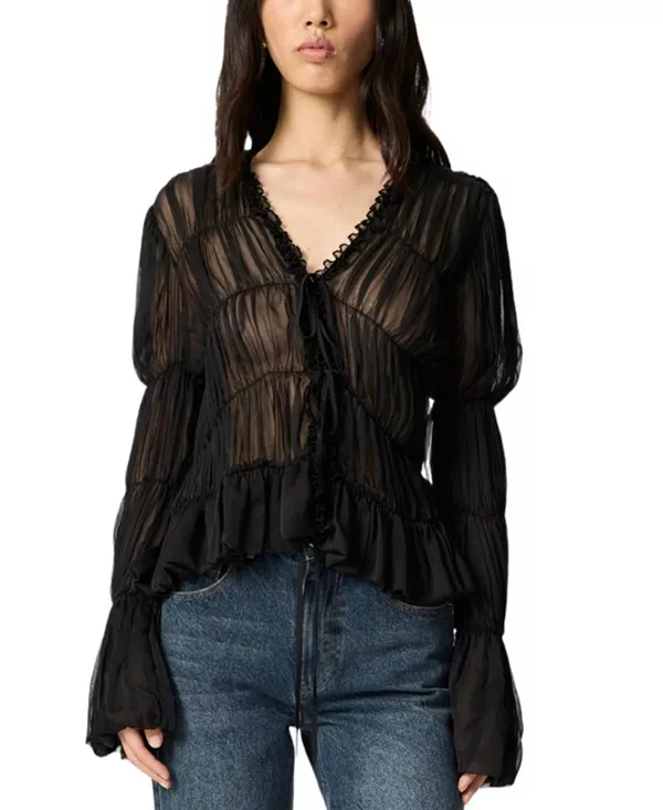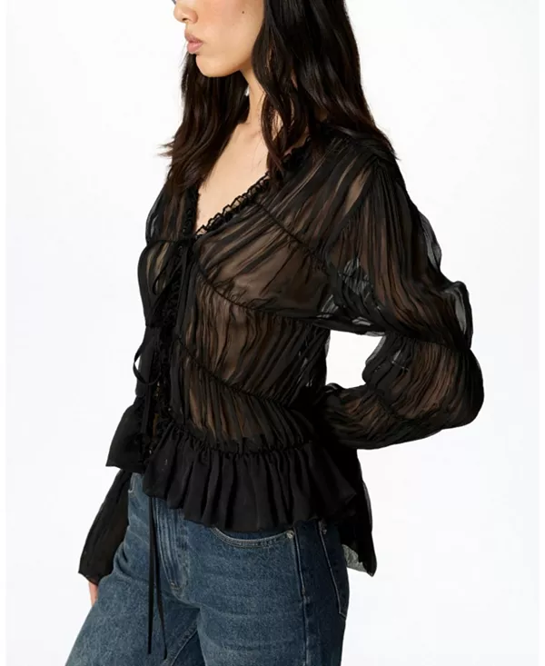 Особенности: Изящная и женственная, эта полупрозрачная блузка со сборками изготовлена из легкой тканой ткани и имеет стандартный силуэт. Глубокий V-образный вырез с завязкой спереди, длинные рукава с манжетами-баллонами и сборки создают идеальный баланс между элегантностью и современным очарованием. Полупрозрачная отделка добавляет изысканности, делая ее идеальным вариантом для вечерних мероприятий, многослойных образов или элегантных дневных нарядов. Импортный товар