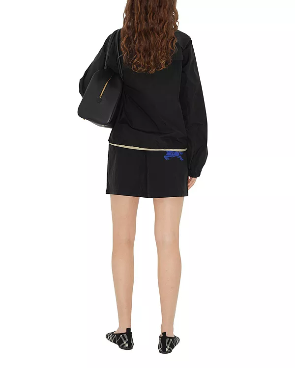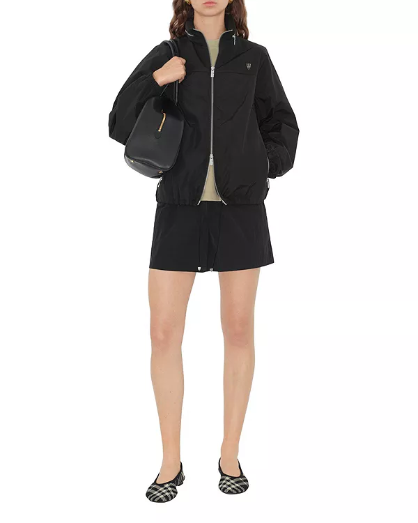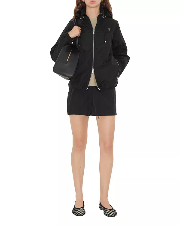 Бренд: Burberry Цвет: черный Легкая куртка с капюшоном из итальянского нейлона и хлопка, с убирающимся капюшоном. Модель имеет стандартный крой и дополнена молниями с вырезом в форме буквы B и эмалированной эмблемой в виде буквы B.