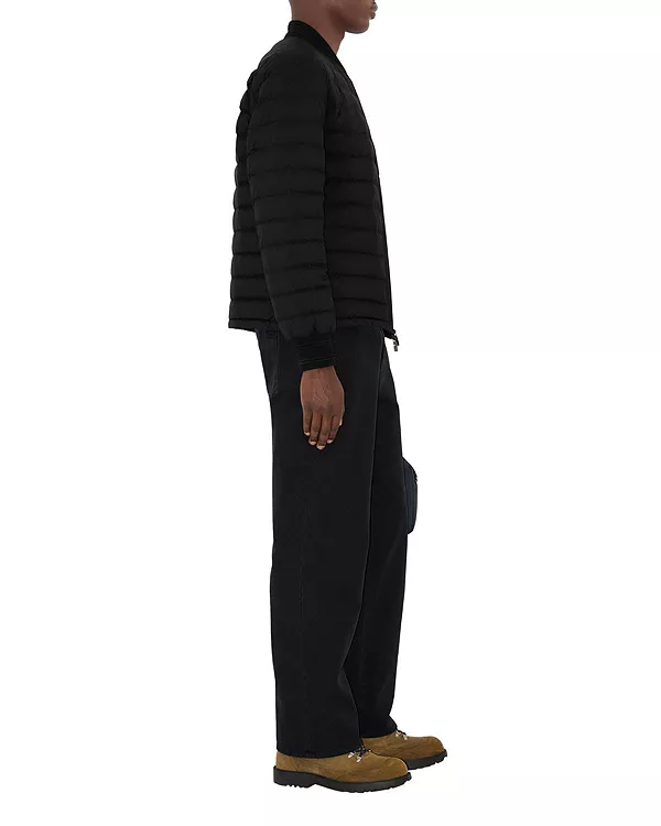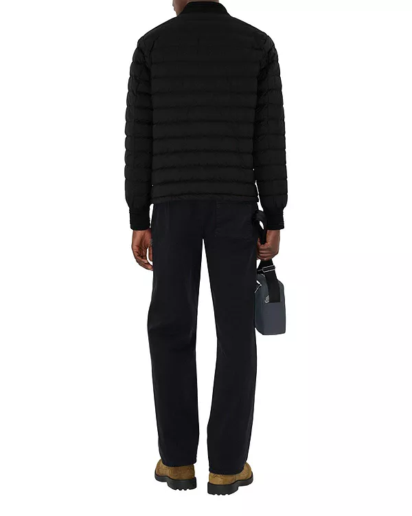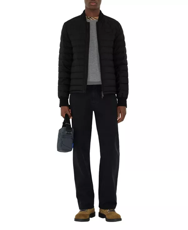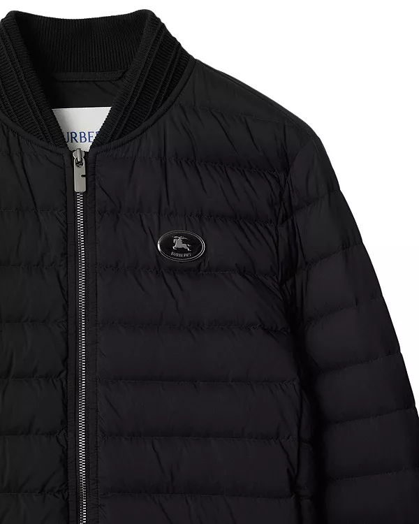 Бренд: Burberry Цвет: черный Легкая пуховая куртка из нейлона, прямого кроя, с трикотажной отделкой в рубчик. Модель украшена кожаной аппликацией в виде рыцаря - архивным мотивом, впервые появившимся на сумках Burberry в 1980-х годах.
