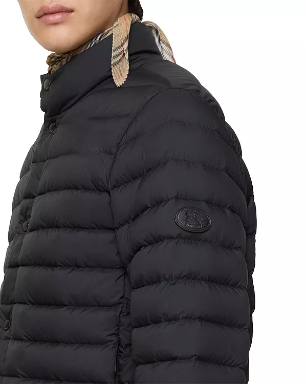 Пуховая куртка Burberry из легкой нейлоновой тафты, утепленная гусиным пухом и перьями. Модель дополнена кожаной аппликацией с фирменным знаком Knight, архивным мотивом, впервые появившимся на сумках Burberry в 1980-х годах.