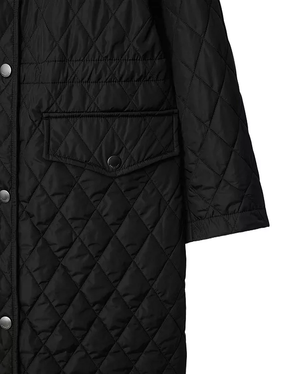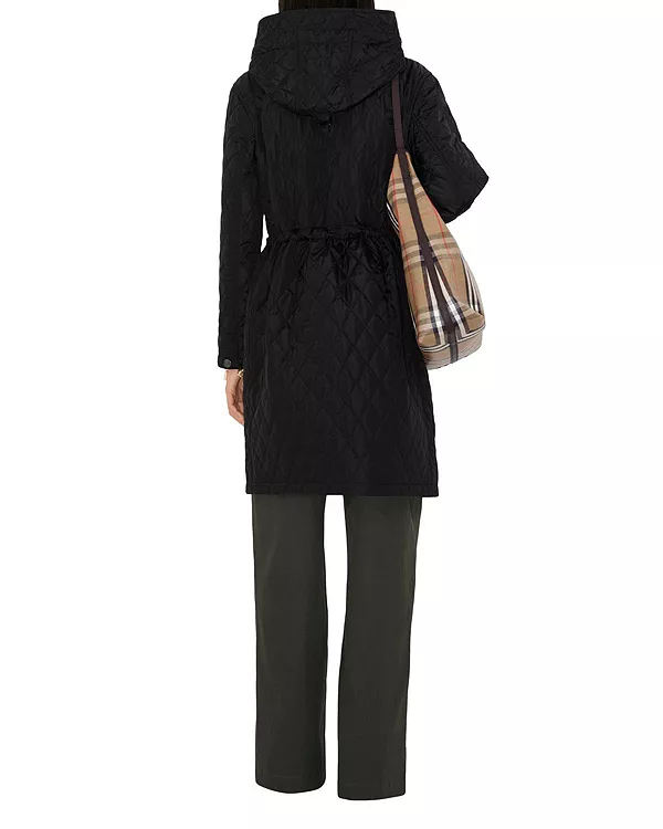 Бренд: Burberry Цвет: черный Стеганое пальто из легкого нейлона с контрастной хлопковой подкладкой в клетку Burberry в нашем фирменном песочно-бежевом цвете. Модель прямого кроя с капюшоном и шнурком для регулировки талии.