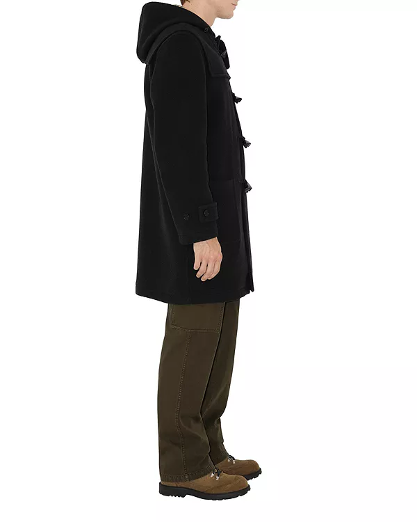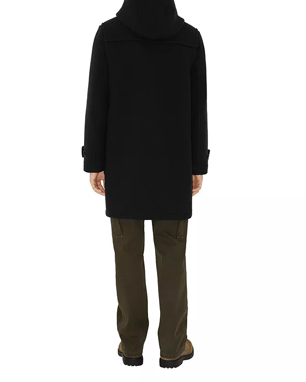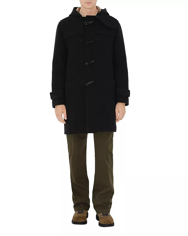 Бренд: Burberry Цвет: черный Дафлкот из итальянской шерстяной саржи с внутренней подкладкой в клетку Burberry. Модель с капюшоном имеет свободный крой и украшена застежками-пуговицами с выгравированным логотипом в форме эмблемы B, мотива, вдохновленного дизайном «Рыцарь-всадник».