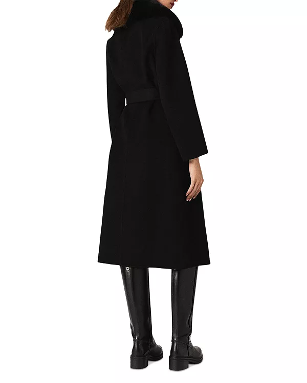Бренд: Maje Цвет: черный В этом сезоне Maje переосмысливает сезонные базовые вещи, окутывая силуэты мягкостью и современностью. Длинное пальто с архитектурным силуэтом, одновременно струящееся и мягкое. Двусторонняя шерсть обеспечивает ему плотную драпировку, а съемный воротник из искусственного меха добавляет нотку ретро-шика. Пояс подчеркивает талию, создавая женственный, структурированный и вневременной образ.
