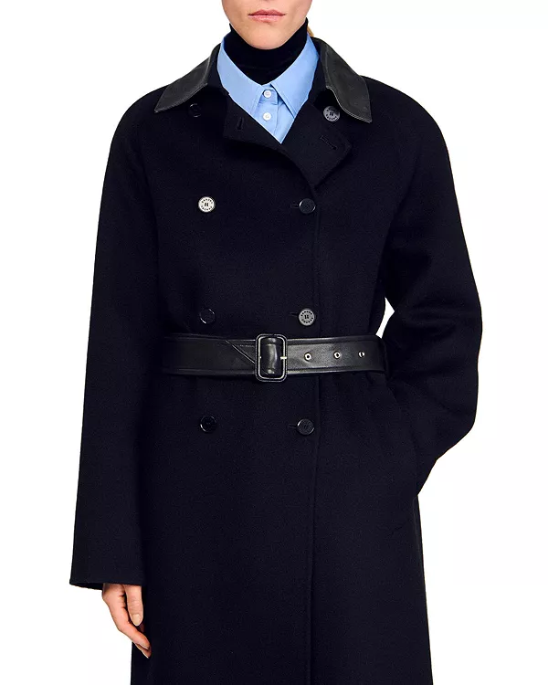 Длинное пальто из шерсти и кожи Sandro, черный