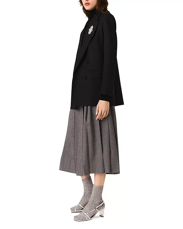 Этот пиджак воплощает в себе структурированную элегантность с элементами высокой моды. Его прямой двубортный крой создает выразительный силуэт, а съемная брошь добавляет изысканности. Тщательная отделка и струящаяся ткань делают его вневременным элементом гардероба.