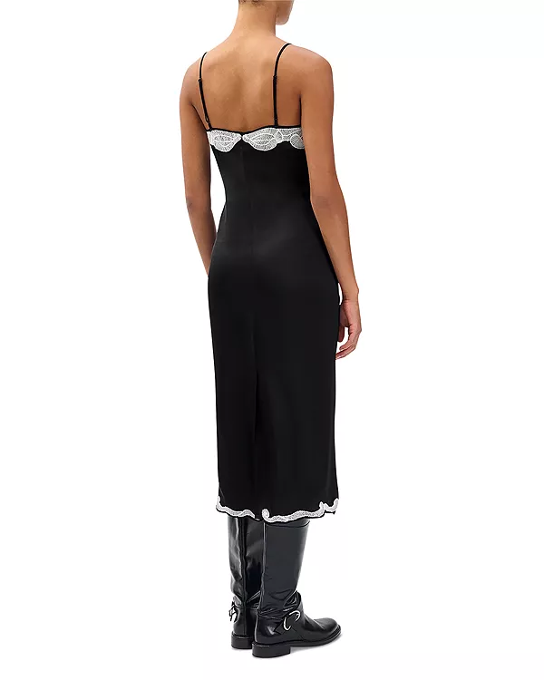 Эта интерпретация классического силуэта выполнена из легкого атласа, который струится как жидкость, и отделана кружевной вышивкой на лифе и подоле. Длина миди идеально подходит для ношения с босоножками на каблуке или высокими сапогами.