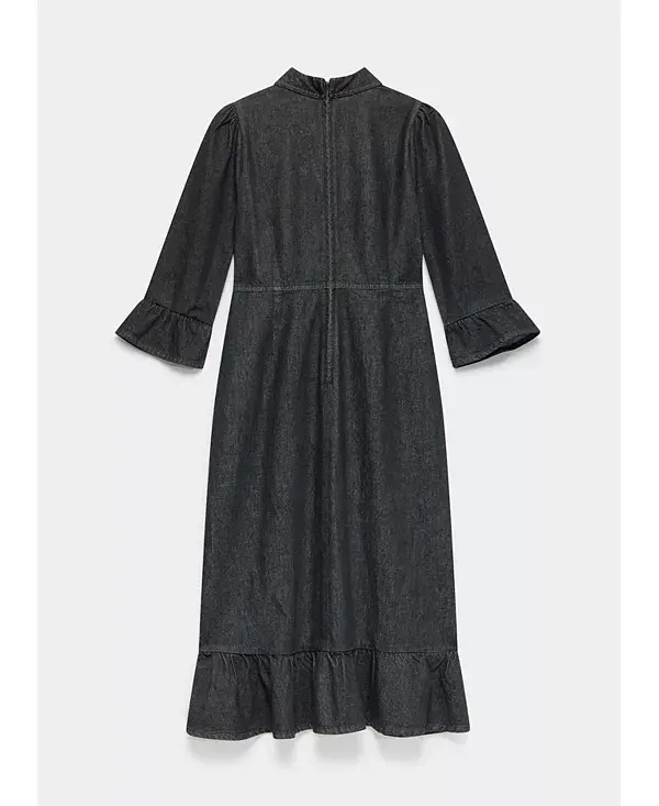 Черное джинсовое платье миди с классическим воротником, рукавами три четверти расклешенными, нагрудными карманами на пуговицах, оборкой по низу и застежкой на золотистые пуговицы спереди.