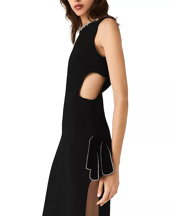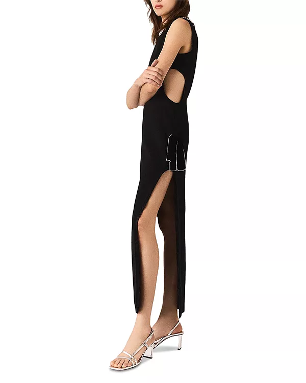 Бренд: Maje Цвет: черный Maje исследует смелую женственность через скульптурные модели, где детали, украшенные драгоценными камнями, подчеркивают силуэт. Это макси-платье без рукавов имеет кутюрный вид и графический силуэт. Вырезы по бокам открывают талию, а два высоких разреза удлиняют ноги. Два структурированных банта, украшенных стразами, подчеркивают талию, а воротник, также украшенный драгоценными камнями, добавляет изысканности.
