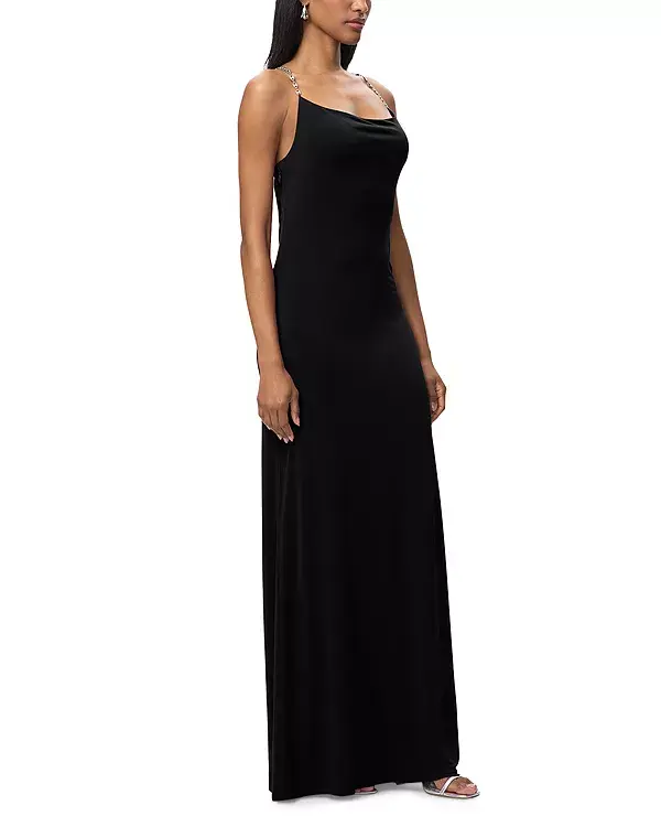 Платье Aviva от Hervé Léger, представленное в образе № 15 из лукбука коллекции Resort '26, сшито из облегающего фирменного трикотажа с серебряными цепочками. Платье имеет слегка драпированный вырез и эффектную низкую спинку с драпировкой, выполнено на подкладке и дополнено высоким боковым разрезом и боковой молнией.