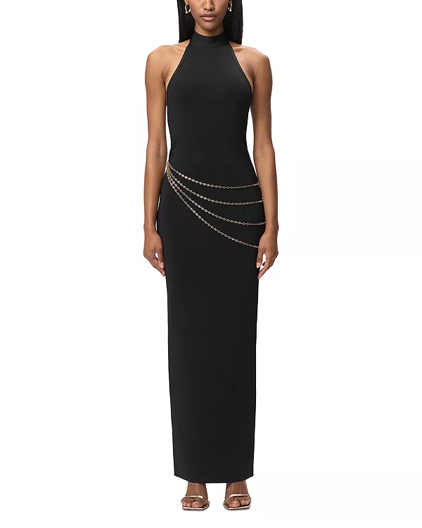 Новинка коллекции Resort '26, платье Sybil от Hervé Léger, сшитое из плотного трикотажа, имеет облегающий силуэт. Платье длиной до щиколотки с высоким воротником-халтером, открытой спиной и съемной драпировкой из золотых цепочек дополнено разрезом сзади и застежкой-молнией по центру спины.