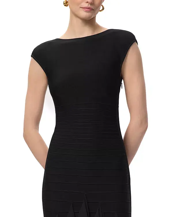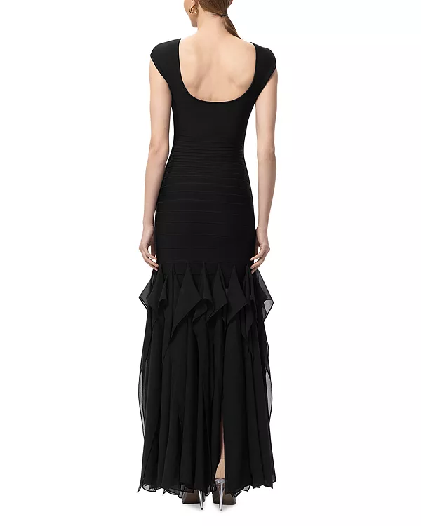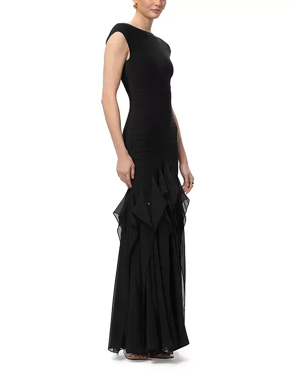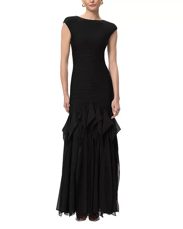 Платье Mya имеет облегающий лиф из градиентной бандажной ткани, в сочетании с ниспадающей юбкой из жоржета и прозрачными вставками. Силуэт полной длины дополнен короткими рукавами, вырезом-лодочкой и открытой спиной. Завершает образ мини-подкладка и боковая молния.
