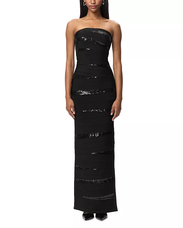 Новинка коллекции Resort '26, платье Chiara от Hervé Léger, выполненное в градиентном бандажном стиле длиной до щиколотки, украшено вышитыми пайетками деталями в виде бандажа. Модель без бретелей, с боковым разрезом и боковой молнией, завершает образ.