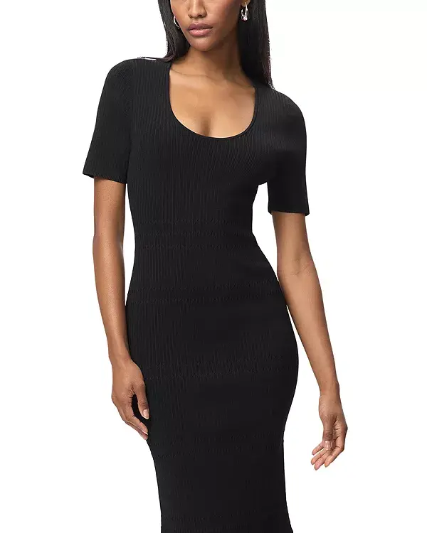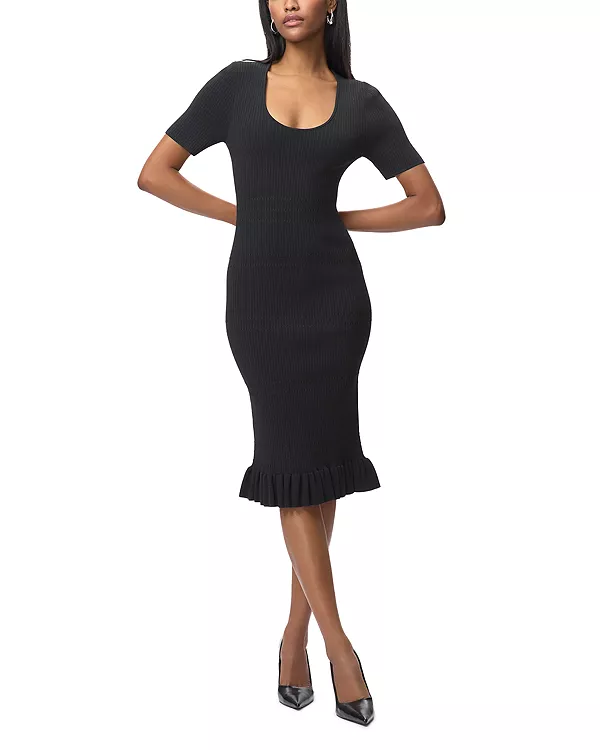 Платье Cosette от Hervé Léger, новинка коллекции Resort '26, выполнено из трикотажа средней плотности и имеет удобный, практичный силуэт. Это универсальное повседневное платье миди с вырезом-лодочкой, короткими рукавами и оборками по низу.