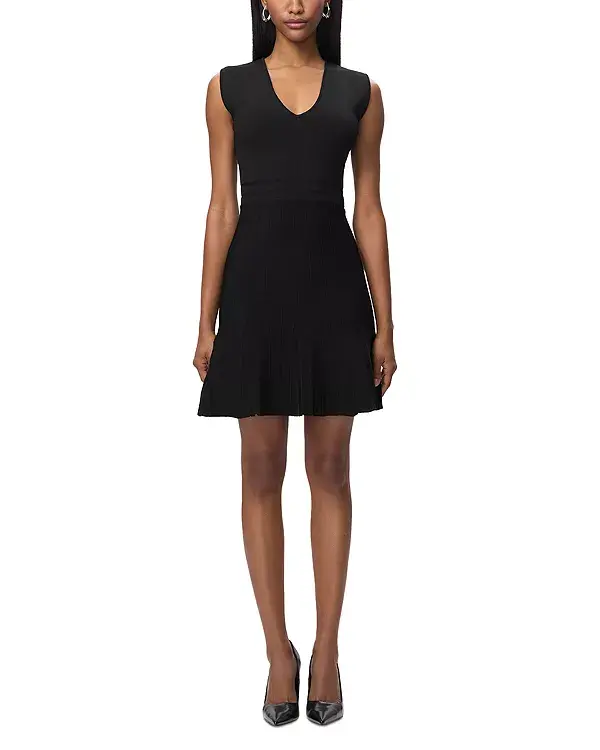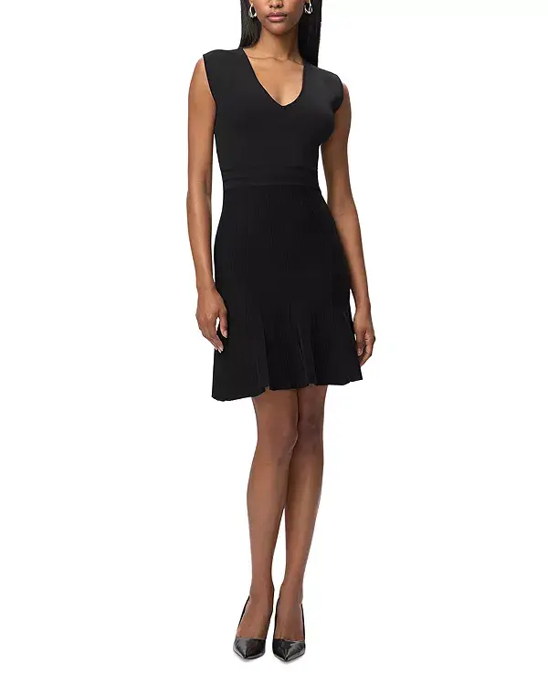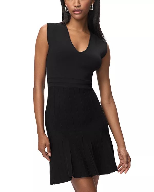 Платье Azalea от Hervé Léger, сшитое из трикотажа средней плотности, представляет собой повседневный силуэт с V-образным вырезом и декоративной строчкой. Длина до колена, расклешенный низ и потайная молния по центру спины.