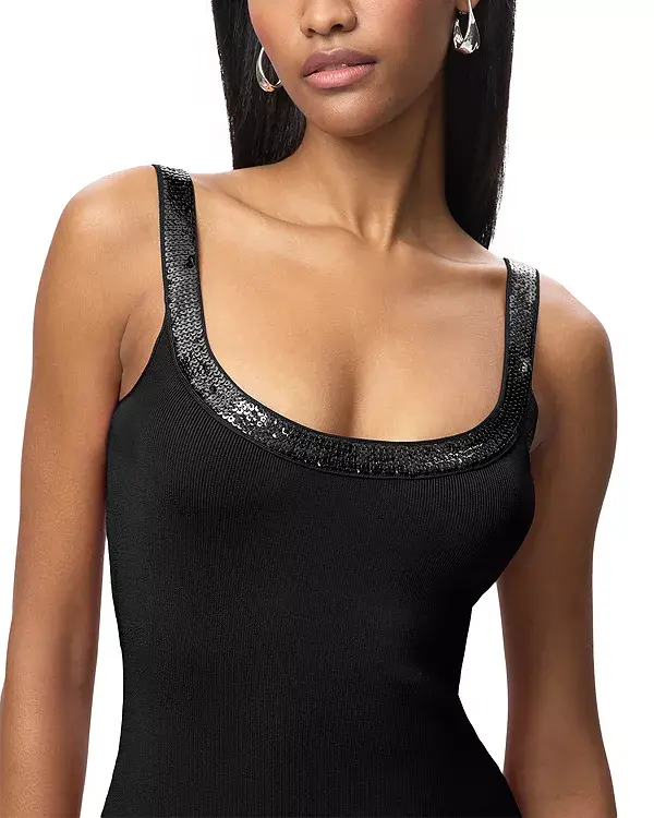 Новинка коллекции Resort '26, платье Cove от Hervé Léger - это облегающее мини-платье из плотного трикотажа. Силуэт украшен вышитым пайетками вырезом-лодочкой и застежкой-молнией по центру спины.