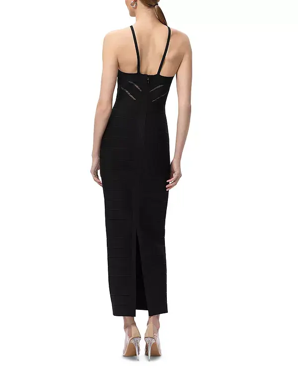 Платье Ava отличается высоким вырезом-халтером и прозрачными вставками. Лиф выполнен из настоящего бандажа на сетчатой подкладке, а длинная юбка имеет разрез по центру спины и застежку-молнию.