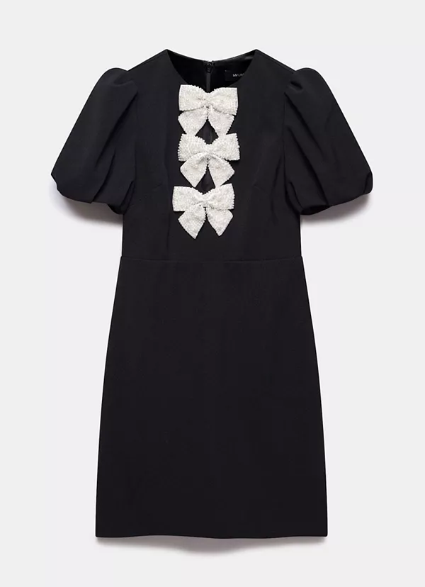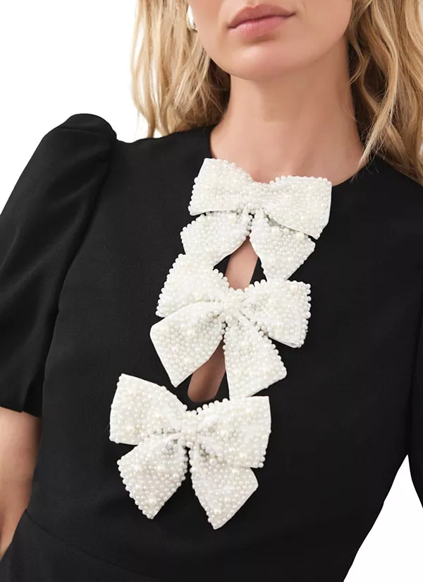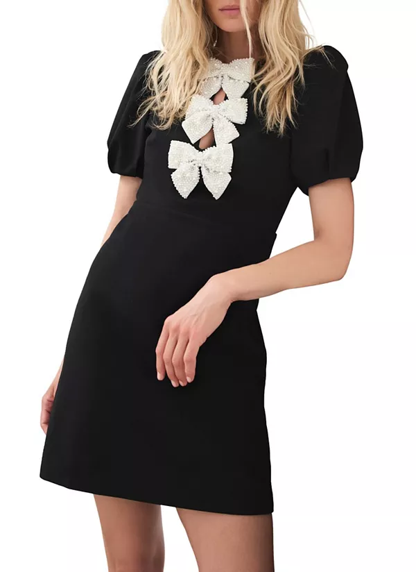Платье мини-силуэта с круглым вырезом, вырезом-капелькой спереди, отделкой в виде банта из бисера, короткими рукавами-фонариками и застежкой-молнией сзади.