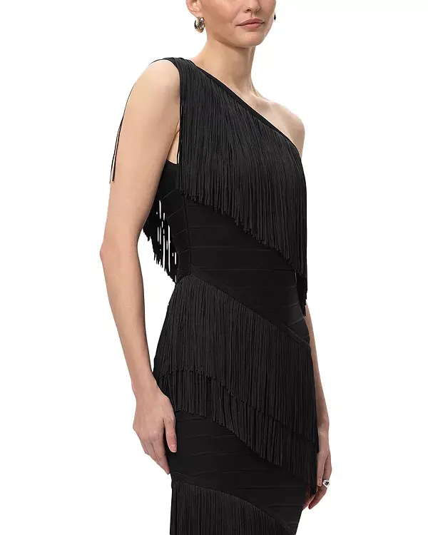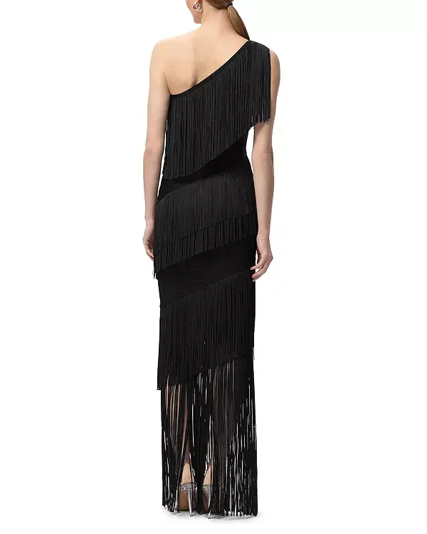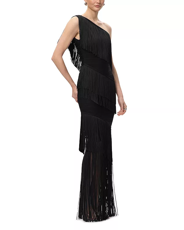 Платье «Элеонора» имеет силуэт на одно плечо, облегающий лиф и ниспадающую юбку с бахромой. Дополняет образ нижняя юбка длиной до колена и боковая молния.