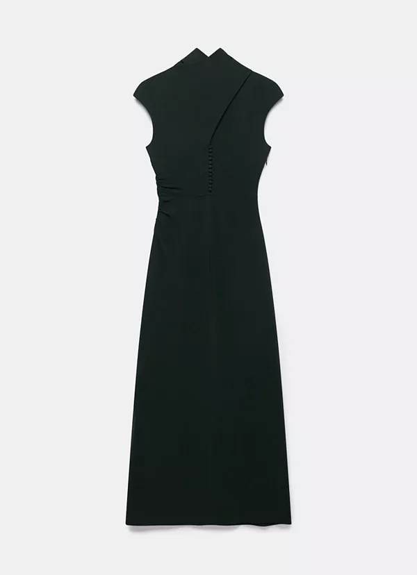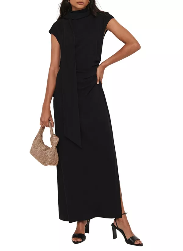 Черное платье макси-силуэта с завязками на шее, короткими рукавами, сборками по бокам, разрезом спереди, застежкой на пуговицы сзади и молнией сбоку.