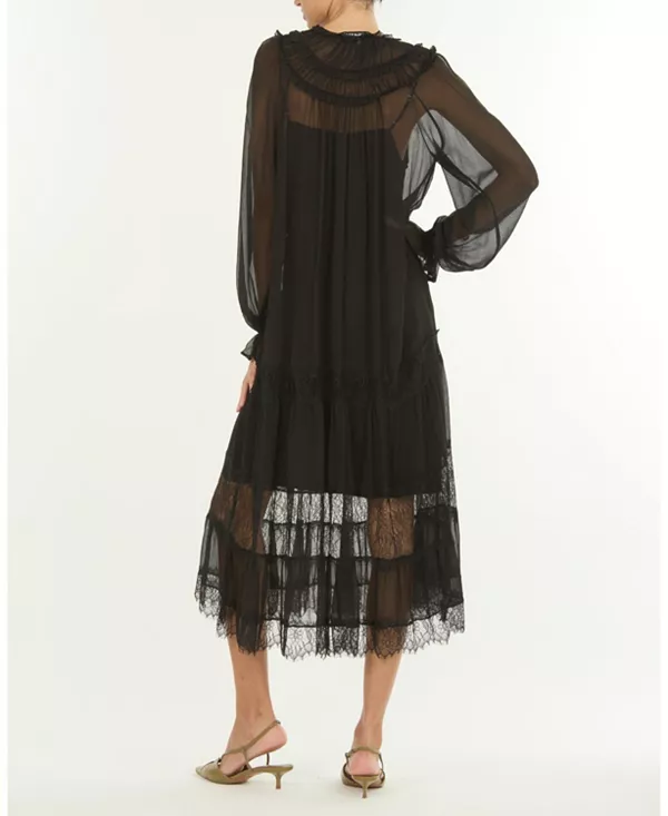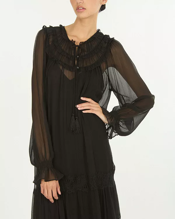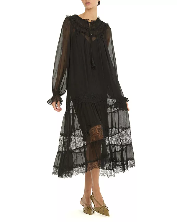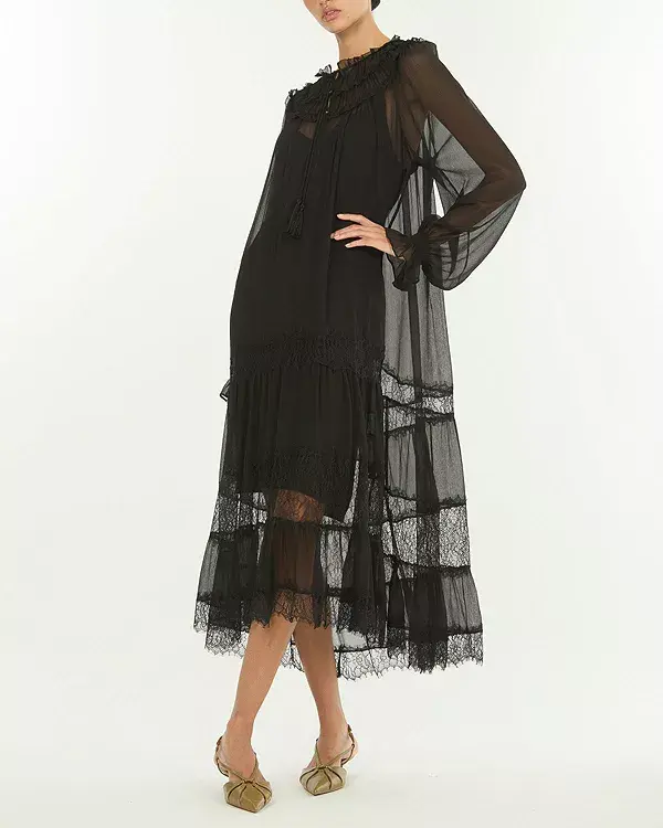 Сшитое из 100% органического шелкового шифона с кружевными вставками, макси-платье Bree отличается воздушной, романтической драпировкой. Прозрачные рукава, многослойный кружевной подол и струящийся силуэт воплощают вневременную элегантность и непринужденную изысканность.