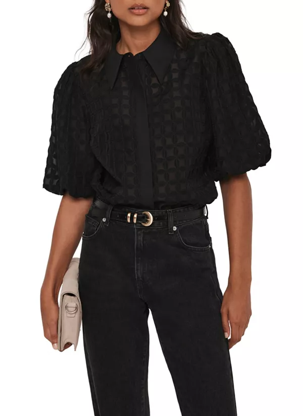 Черная рубашка с аппликацией в виде лепестков, классическим воротником, короткими рукавами-фонариками и потайной застежкой на пуговицы спереди.