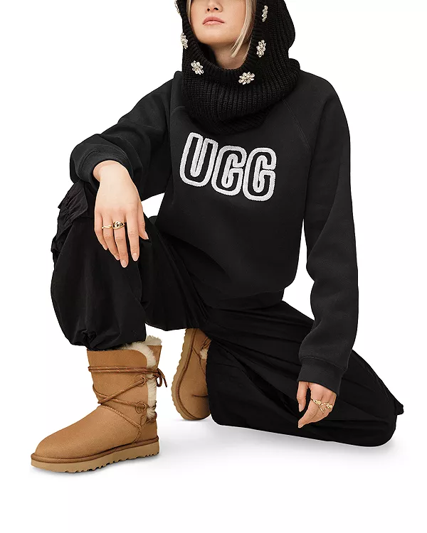 Свитшот UGG Logo Crewneck - это классическая повседневная модель, изготовленная из мягкой хлопковой смеси, с рукавами реглан и графическим логотипом UGG из синели.