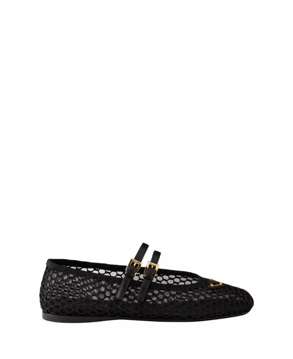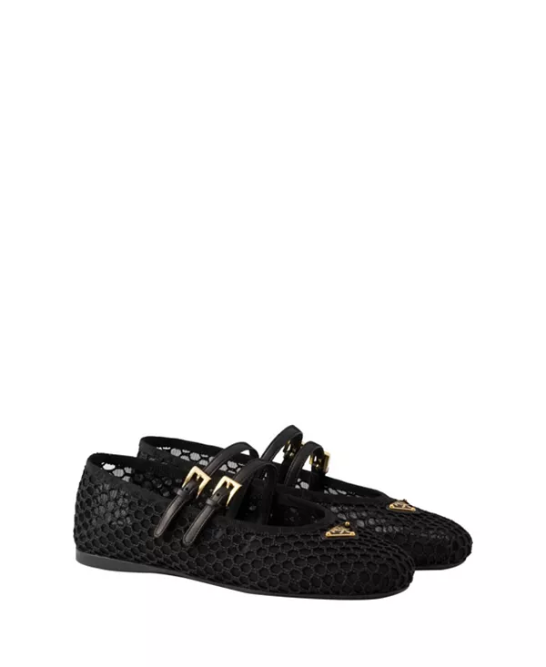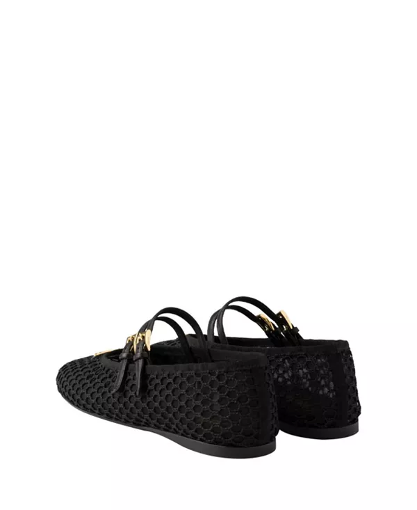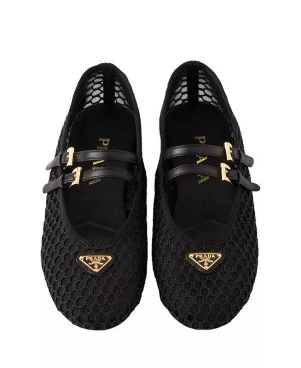 Бренд: Prada Цвет: черный Эти сетчатые балетки Prada, сочетающие в себе вневременную классику и современность, переосмысливают классику благодаря двойному ремешку, изящному логотипу и сетке в стиле макраме.