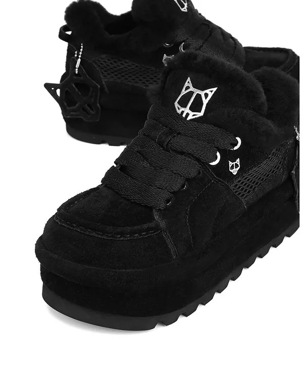Особенности: Закругленный носок Шнуровка Шнурки шириной 15 мм | Асимметричная форма носка | Металлические люверсы | Высота платформы: 60 мм | Металлическая булавка в виде головы волка | Замша и сетка снаружи | Меховая подкладка | Кожаная стелька | Мягкая, легкая и упругая подошва | Съемная замшевая булавка в виде головы волка Импортный товар