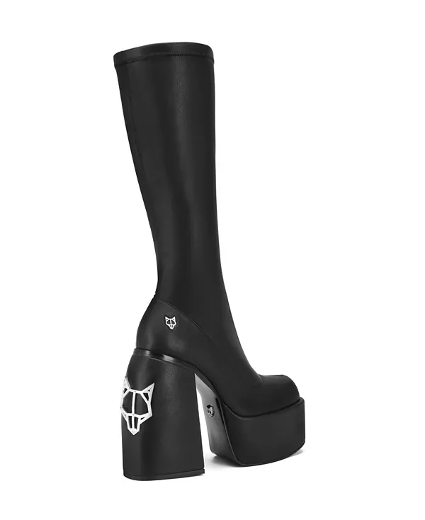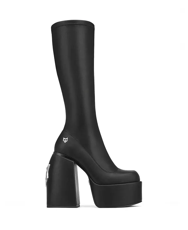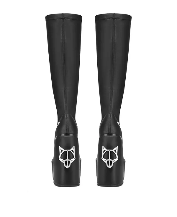 Бренд: Naked Wolfe Цвет: черный Представляем Spice - наши облегающие сапоги на платформе в стиле 90-х, которые подчеркивают фигуру ниже колена. Верх выполнен из эластичного материала, приятного на ощупь, на платформе и каблуке, разработанных специально для Naked Wolfe. Сапоги украшены фирменной нашивкой в виде головы волка Naked Wolfe на каблуке и металлической вставкой в виде головы волка, встроенной в каблук.