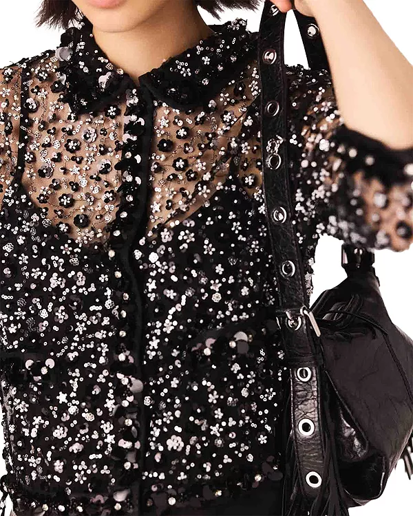 Эта укороченная рубашка Maje, сочетающая уверенный стиль с блестящими акцентами, по-новому интерпретирует прозрачность благодаря тюлю, расшитому пайетками и бусинами, играющему на ослепительном серебристом эффекте омбре и контрасте текстур между матовым бархатом, игривыми помпонами и блеском украшений.